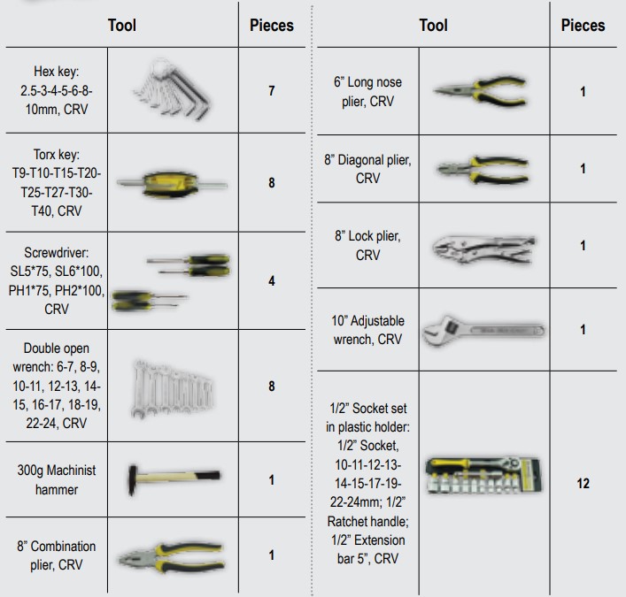 Lalizasov komplet alata za pomorce dovoljan je za većinu popravaka na brodu. Sastoji se od skoro svog potrebnog alata kao što su ključevi, odvijači, kliješta, električni multimetar i mnogo drugog alata koji je definitivno koristan za rad na palubi, na motoru ili na električnim i elektroničkim uređajima. Sav alat izrađen je od trajnog kromvanadij materijala, ne hrđa i ima dugi vijek trajanja. Za njegovo lakše pohranjivanje i prenošenje Lalizas je osigurao kutiju od izdržljive plastike, dostupne u dvije veličine, ovisno o modelu i uključenom alatu.