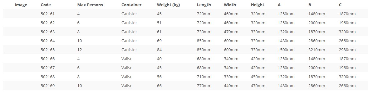 *Max broj osoba: 10*Pakiranje: čvrsto*Težina: 79 Kg*Dužina: 850 mm*Širina: 600 mm*Visina: 330 mm*Širina otvorene splavi: 1990 mm*Dužina otvorene splavi: 3760 mm*Visina otvorene splavi: 1340 mm
