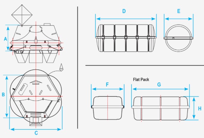 *Max broj osoba: 10*Pakiranje: čvrsto*Dužina: 1230 mm*Promjer: 630 mm*Visina otvorene splavi: 1400 mm*Širina otvorene splavi: 2694 mm*Dužina otvorene splavi: 2694 mm*Težina: 98 kg